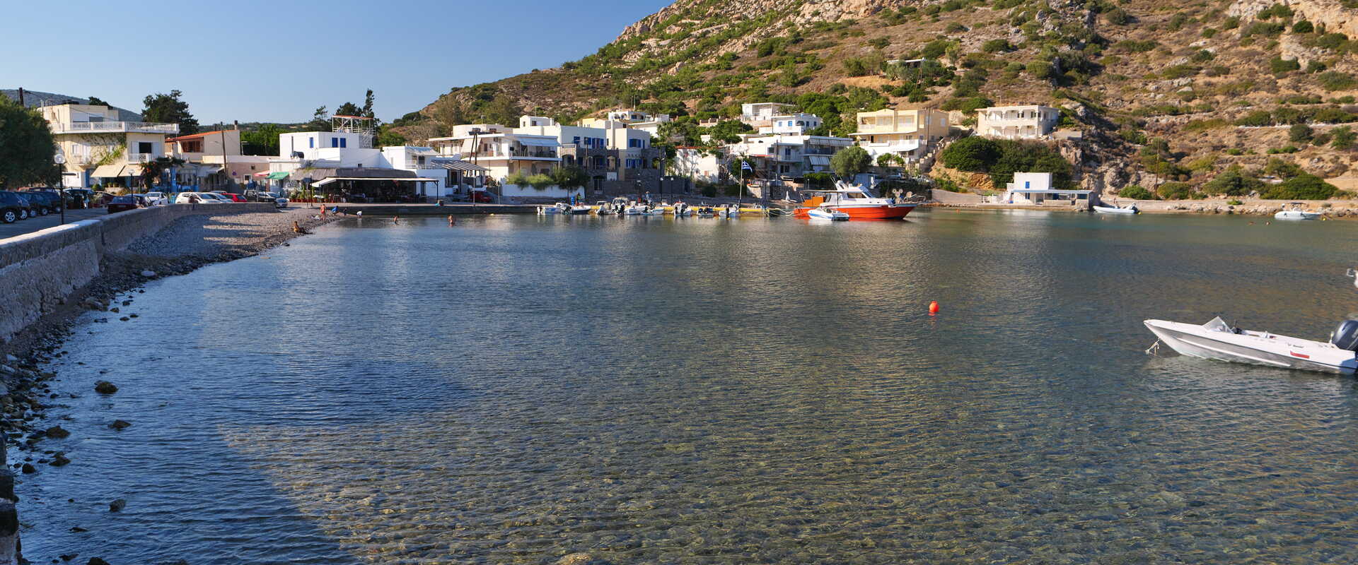 Hlavní pláž u Emborios je oblázková s černými kameny a hloubkou moře přímo u břehu – voda je proto ideální pro milovníky plavání a šnorchlování. V docházkové vzdálenosti leží známá pláž Mavra Volia (černý písek/oblázky), která vznikla v důsledku starodávné sopečné činnosti.